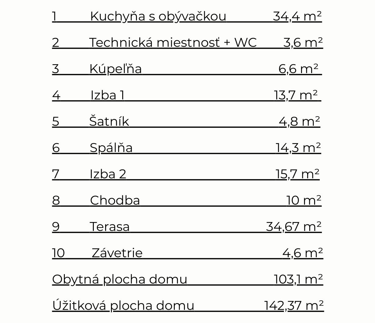 - Zastavaná plocha: 142,37 m² (vrátane terasy a závetria)