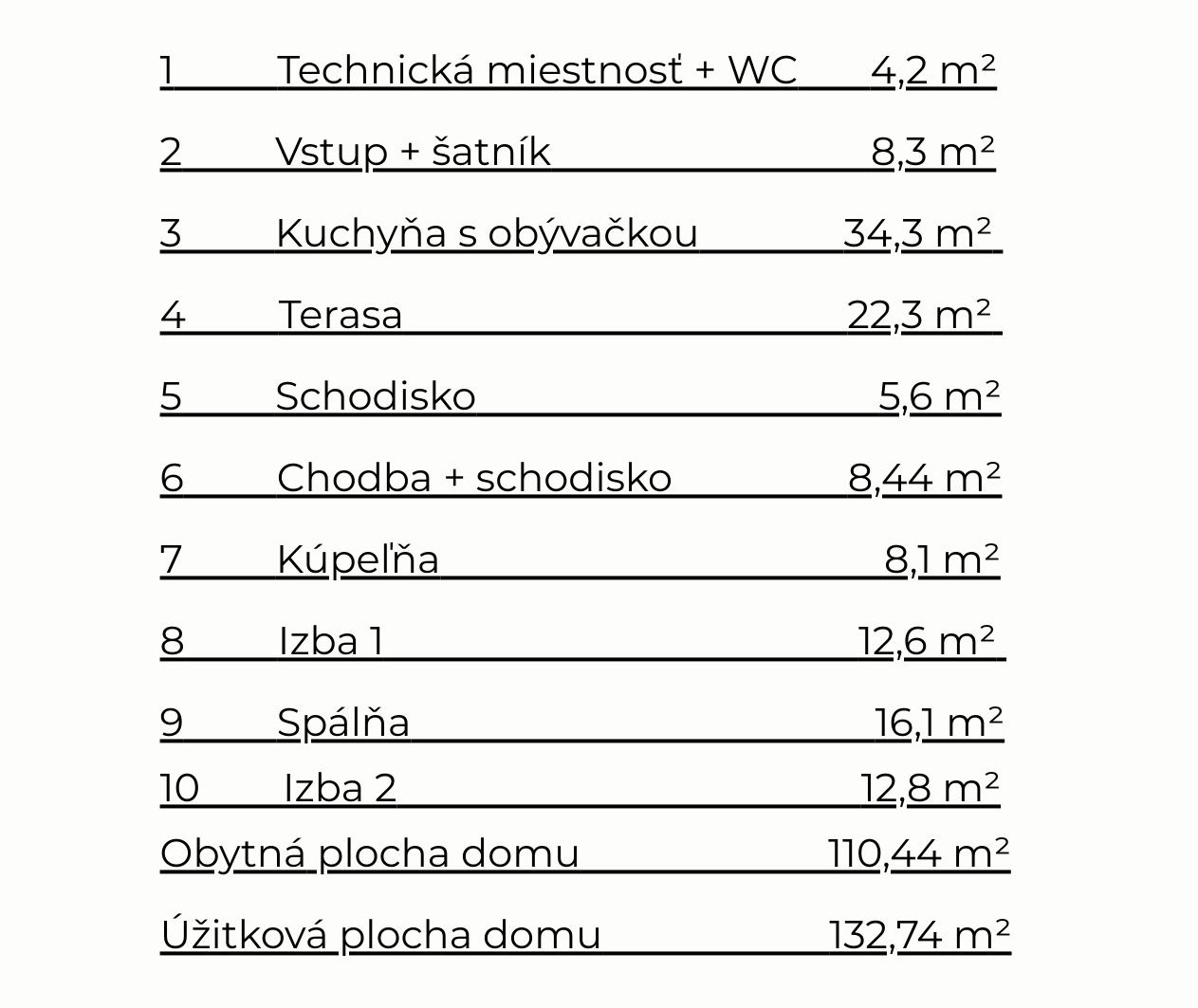 - Zastavaná plocha: 132,74 m² (vrátane terasy)